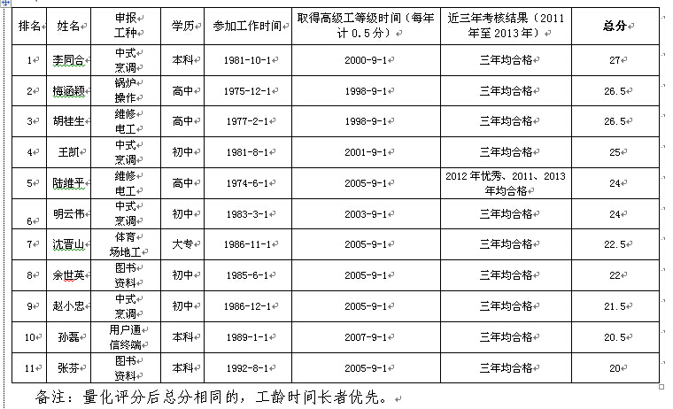 根据江西省人社厅《关于开展全省机关事业单位工勤人员岗位等级考核工作的通知》(赣人社发〔2014〕453号)和九江市人社局及学校有关文件精神,学校开展了工勤人员岗位等级考核申报工作。经九江市人社局核定,本次工勤人员岗位等级考核学校有2名技师职数,组织人事部按照《BB贝博艾弗森官方网站岗位设置实施暂行方案》(九院字[2014]48号)中《BB贝博艾弗森官方网站专业技术和工勤技能岗位竞聘量化评分细则》有关规定,组织了相关部门对申报技师人员进行了资格审查和量化评分。依据量化评分情况,学校将从高分到低分等额推荐申报,现将符合申报技师条件人员的量化评分结果公示如下: