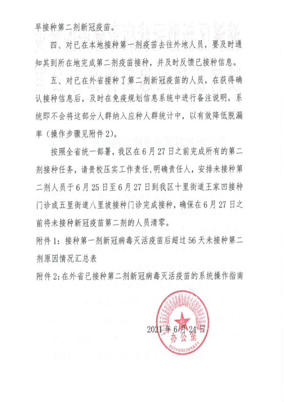 一、在学校临时接种点已接种第一针还未完成第二剂接种的师生请于6月25日至6月27日到濂溪区十里街道王家凹接种门诊或五里街道八里坡接种门诊完成接种,时间每天早上8:00开始。