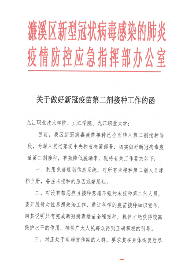 目前,贝博官网临时接种点新冠病毒疫苗接种工作已基本结束,为深入贯彻落实中央和省市决策部署,切实做好新冠病毒疫苗第二剂接种,有效降低脱漏率,按照濂溪区防控指挥部《关于做好新冠疫苗第二针接种工作的函》的要求,现将学校进一步做好新冠疫苗第二剂接种工作通知如下: