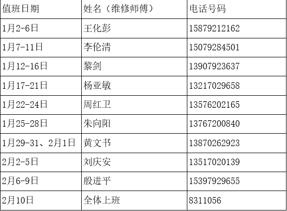 2023年寒假期间水电维修小修维修人员值班安排如下: