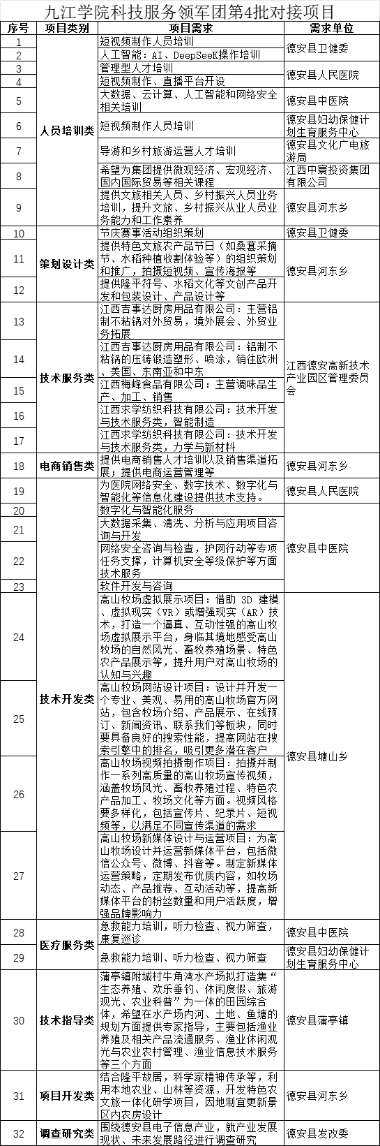 为贯彻落实《BB贝博艾弗森官方网站服务九江经济社会发展三年行动计划(2024-2026)》(九院党字〔2024〕66号)文件要求,通过科技服务领军团对德安县经济社会发展相关需求进行征集,确定以下32项为第4批社会服务项目,现面向全校发布项目信息。