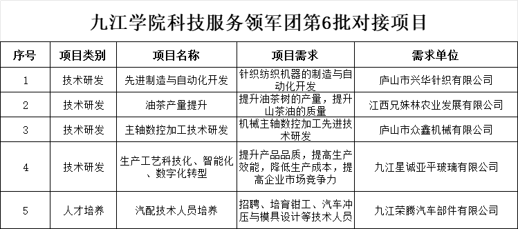 为贯彻落实《BB贝博艾弗森官方网站服务九江经济社会发展三年行动计划(2024-2026)》(九院党字〔2024〕66号)文件要求,通过科技服务领军团对庐山市经济社会发展相关需求进行征集,确定以下5项为第6批社会服务项目,现面向全校发布项目信息。