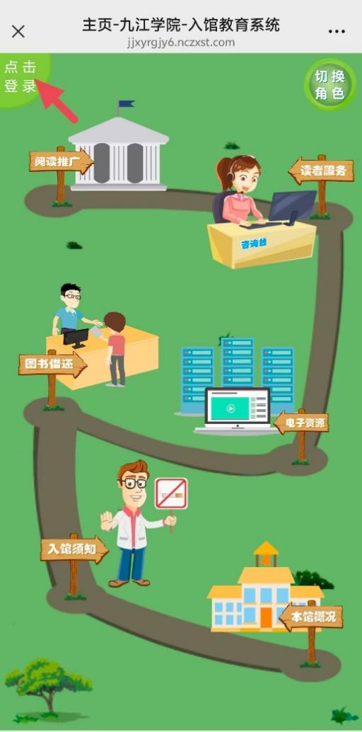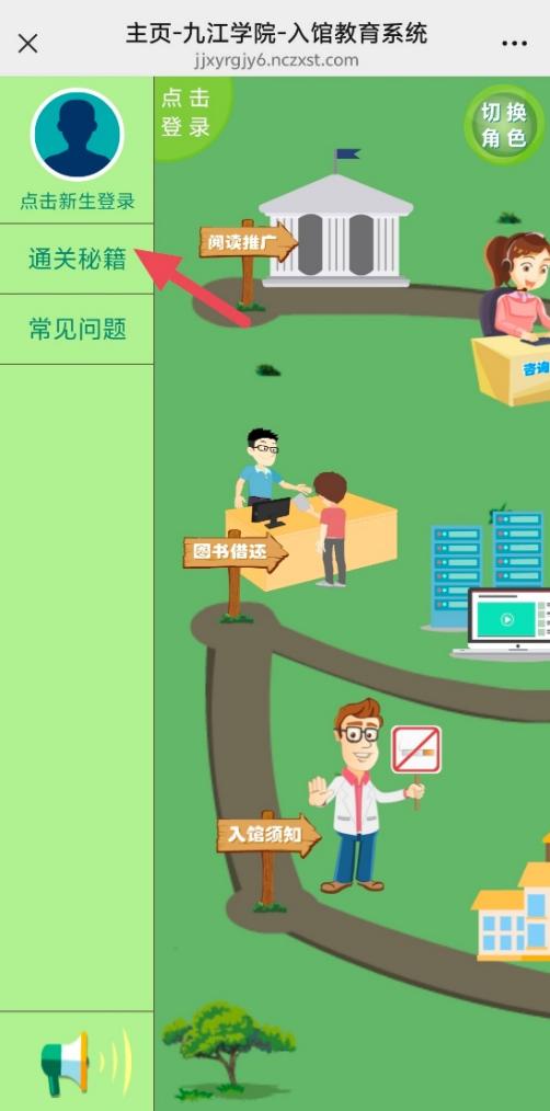 3.登录完成后进入游戏页面,依次点击进入“本馆概况—入馆须知—图书借还—电子资源—读者服务—阅读推广”等模块进行学习闯关。每一个模块学习完后,均需点击右上角返回键,再点击右下角“闯关”进行测试;答错一道题目时,可以使用道具来重获一次答题机会,一个关卡只能使用一次道具,如果使用道具后还是没有答对题目,则闯关失败,需要重新学习。全部闯关完成且成绩在80分以上为合格,系统将自动为读者开通图书借阅权限。