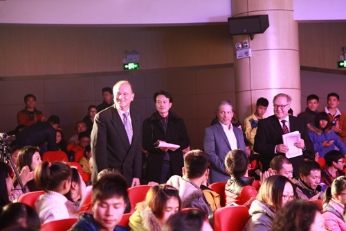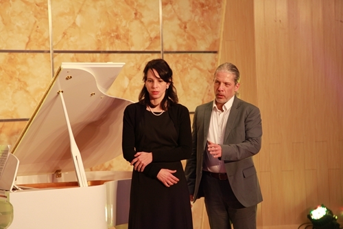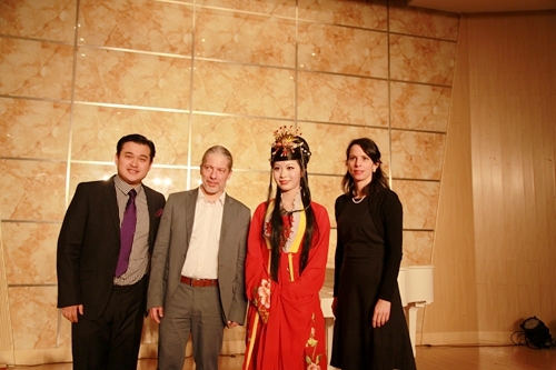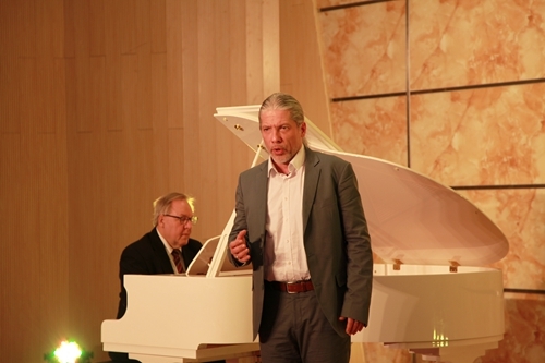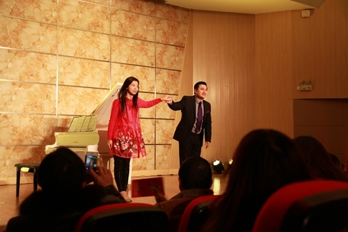 著名德国抒情花腔女高音歌唱家莎拉·莱恩格勒女士,毕业于著名的奥地利维也纳音乐学院。她在晚会上独唱了一首《你是我挚爱的人》的歌曲,由哈根音乐学校的校长施罗德为其钢琴伴奏。著名男中音歌唱家乌尔夫·梅德勒先生,毕业于奥地利萨尔茨堡音乐学院,是一位活跃在欧洲各大小歌剧院的舞台上的著名歌者。他则演唱了选自瓦格纳歌剧《唐豪瑟尔》咏叹调“晚星颂”,由德国著名的钢琴家和钢琴教育家罗兰·普洛尔为其钢琴伴奏。罗兰·普洛尔还随后为莎拉·莱恩格勒女士和乌尔夫·梅德勒先生重唱——选自莫扎特歌剧《唐璜》的《让我们携手同行》伴奏,包括晚会最后的三重唱《今夜无人入睡》的钢琴伴奏。熊柯嘉先生、莎拉·莱恩格勒女士和乌尔夫·梅德勒先生共同演唱了《图兰朵》中的选段《今夜无人入睡》。对于观众来说,这首曲子算是耳熟能详了,闻听过很多歌唱家演唱,似乎多了一份共鸣。其中,体育学院的同学还表演了健美操《青春活力》,正如同他们的青春激情澎湃,充满活力。