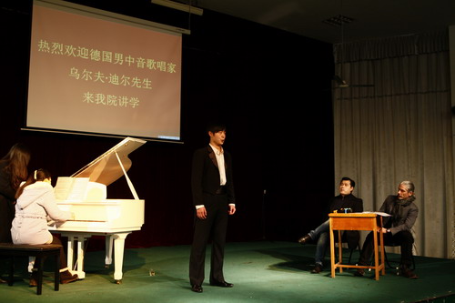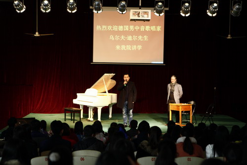 1月8日上午,德国音乐家团队男中音歌唱家乌尔夫·迪尔在香远楼报告厅为艺术学院师生上声乐大课,并现场对音乐专业学生进行了教学指导。艺术学院音乐专业师生共同观摩了此次教学。音乐家熊柯嘉博士担任了现场翻译。