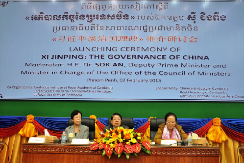 2月2日,由中国驻柬埔寨大使馆、孔子学院总部、柬埔寨王家研究院共同主办、柬埔寨王家研究院孔子学院具体承办的“《习近平谈治国理政》推介研讨会”在柬埔寨总理府友谊大厦举行。柬埔寨副首相兼内阁办公厅大臣索安(Sok An)、中国驻柬埔寨大使布建国、柬埔寨王家研究院院长克罗提达(Kholt Thyda)、人民出版社社长黄书元、柬埔寨王家研究院孔子学院院长谢莫尼勒(Chea Munyrith)、中方院长帅式毅、中国现代国际关系研究院院长特别助理杜彦钧、BB贝博艾弗森官方网站专家汪红梅、云南省新知集团董事长李勇、东南亚电信柬埔寨总经理韩汉畴等出席了研讨会。来自柬埔寨王家行政学院省长培训班的200名学员、政府、议会、高校、媒体、智库等共1200余名各界人士参加。