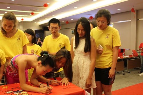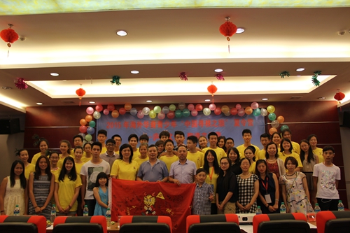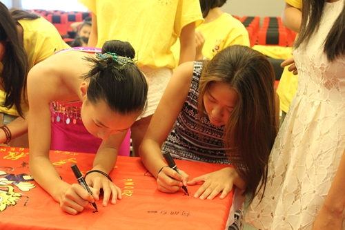 仪式最后,领导和营员与领队老师们合影留念,组织大家举行了夏令营营旗签名活动。营员和领队老师陆续走上主席台,拿起签字笔,一笔一划地在旗子上写上自己的姓名,表达了对夏令营生活的恋恋不舍以及对老师和工作人员的深厚感情。表示作为中华传人、龙的传人,一定会肩负起中华文化传播的大任,把祖籍国的风景历史文化发扬出去。