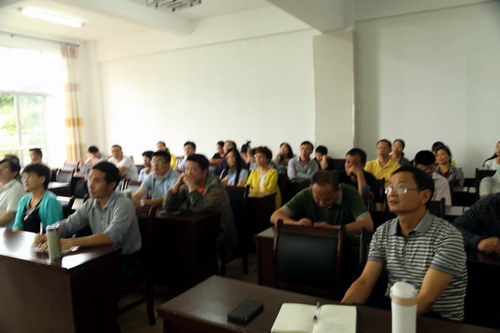8月13日上午,甘校长来到文传学院、学生资助中心2015年庐山暑期培训会场,为大家作了一场题为“中国特色社会主义文化发展道路”的精彩主题报告。报告会由文传学院副院长吴国富主持。文传学院党政领导及教师、学生资助中心负责人及各学院参培老师50余人聆听了报告。