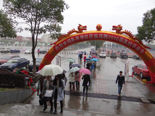招聘会的现场来往的人络绎不绝,即使下着淅淅沥沥的小雨仍不减应聘者们高涨的热情。他们都身着正装,拿着自己精心准备的简历穿梭在招聘现场中,主动的去了解用人单位,并积极地与用人单位进行沟通。