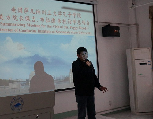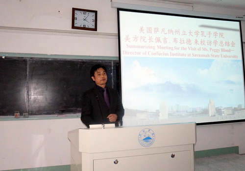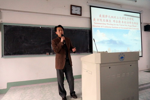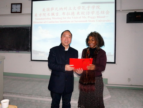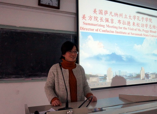 会上,杨副校长代表学校对佩吉.布拉德教授此次访学进行了总结。他指出,布拉德教授的系列精彩讲座不仅使贝博官网学生感受了不同的文化,开阔了学生们的视野,有效地促进了学生专业的提高。布拉德教授本人也体验了中国的文化,了解了中国高等教育现状,双方进行了良好的交流,这将极大的增进两校之间的友谊,促进两校之间的合作,布拉德教授此行成效显著,两校将以此为契机,促进萨凡纳州立大学孔子学院的发展和更多的合作。