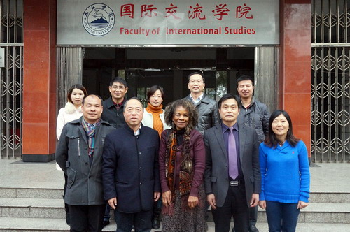 12月4日下午,美国萨凡纳州立大学孔子学院美方院长佩吉.布拉德来校访学总结会在竞秀楼307室举行。甘筱青校长、杨耀防副校长、艺术学院吴维勇院长、外语学院韩琨院长、国际交流学院夏修龙院长、文传学院朱全国副院长以及回国参加全球孔子学院大会的国际处处长、柬埔寨王家学院孔子学院中方院长帅式毅和外语学院副院长、美国萨凡纳州立大学孔子学院中方院长罗其娟出席总结会。国际合作交流处和国际交流学院教师、美国交换生、孔子学院奖学金生及艺术、外语和文传学院学生也参加了会议。会议由国际处副处长王贤淼主持,甘筱青校长为布拉德教授颁发了客座教授荣誉证书。