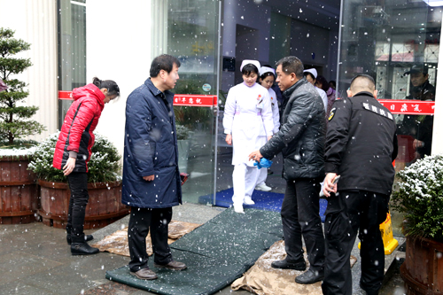 总务科、保卫科分别对东西两院以及口腔医院的各个路面、通道采取了防滑应急措施。温馨提示牌随处可见,同时,医院所有出入口及较滑路段都铺上了防滑的麻袋或地垫。院办对全院的户外标识标牌等进行了安全检查,总务部门对全院水电进行了拉网式巡查,确保医院水电取暖供应正常。