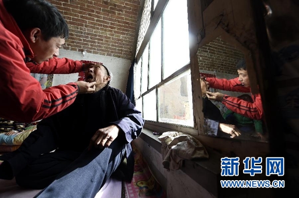 这是2月24日拍摄的贺星龙在给圪垛村移民新村的村民治病。行程40多万公里、骑坏6辆摩托车,用烂12个行医包……在足以绕地球十圈的行医路上,这位80后吃过许多苦。与许多年轻人不同,卫校毕业的贺星龙选择回乡当村医,守着黄土,守护乡亲,一守就是16年。新华社记者 燕雁摄