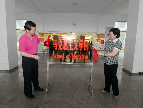 在热烈的掌声中,校党委书记郑翔、副校长吴桃娥共同为马克思主义学院揭牌。