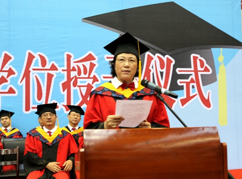 授予证书,师生情长。在热烈的掌声中,校党委书记郑翔博士和副校长吴桃娥给优秀毕业生代表颁发毕业证书。10名优秀毕业生代表依次走上前去接受郑书记和吴副校长颁发的毕业证书,并逐个与郑书记和吴副校长合影留念。