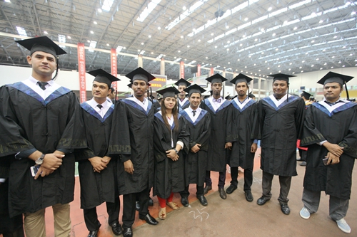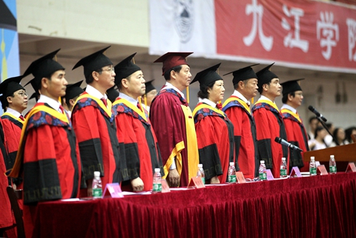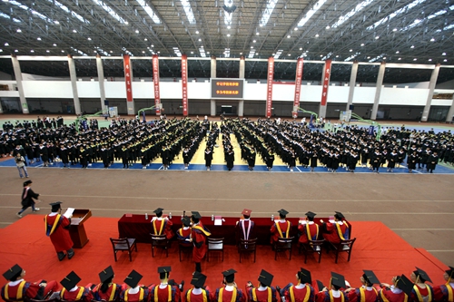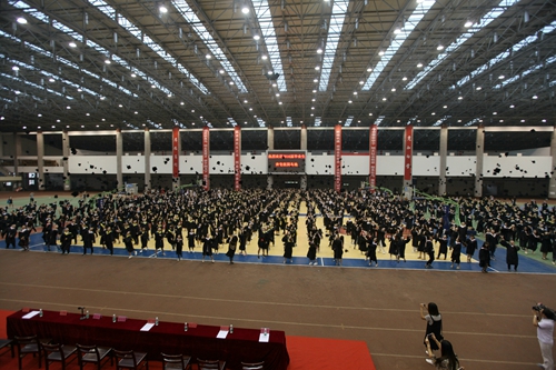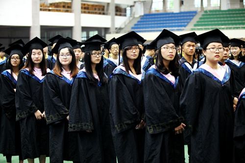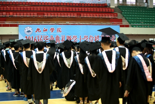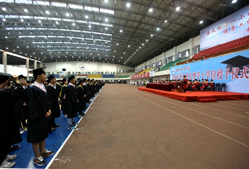 典礼现场,毕业生们统一身着学士服,庄严肃穆。田径馆电子屏幕上“热烈欢送2016届毕业生奔赴祖国各地” 、“牢记学校培养情,争为母校添光彩”、“今日桃李芬芳,明日国家栋梁”表达了学校对毕业生生的殷切希望。毕业典礼暨学位授予仪式在雄壮的国歌声中开始。