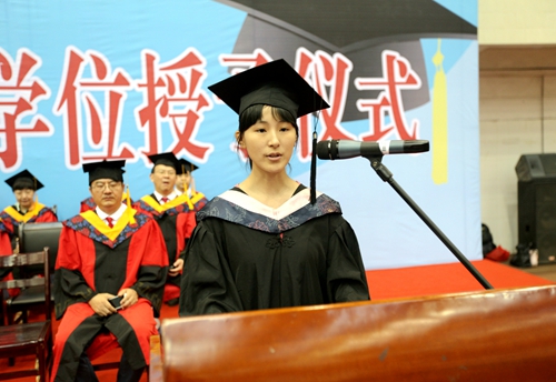 毕业生代表、校十佳勤奋学习标兵、会计学院A1225班李宇娜同学代表2016届一万余名毕业生向母校表达了发自内心的深情谢意,她说,大学期间,高中同学来访,大一时,我带他们转莲池蝶湖三食堂;大二时,带他们转图书馆、看两南山;大三时,带他们转大学科技园、请他们到创客咖啡青春有约;大四时,我和室友一起在学校的角角落落,回忆我们共渡的点滴。四年里,有人埋首苦读,考入理想的学校深造;有人坚持晨跑,毅力满满;有人玩转社团,度过一个精彩纷呈的大学生活;有人行走在志愿一线,找到了青春的价值;有人创新创业,在大众创业万众创新的风口展翅高飞。每一种生活都意义非凡,每一段经验都价值连城。竞知向学,厚德笃行的校训和内化于心的三大特色教育,成为我们每个毕业生永久的DNA和识别码。她向母校承诺:我们的努力将无悔于自己的青春和志向,我们的拼搏将无愧于九院对我们的培养,我们会在未来奋斗的道路上永远坚守中国梦的气度,我们将在新的征途中,继续抒写属于九院人的华章。衷心祝愿母校永葆青春,再创辉煌!