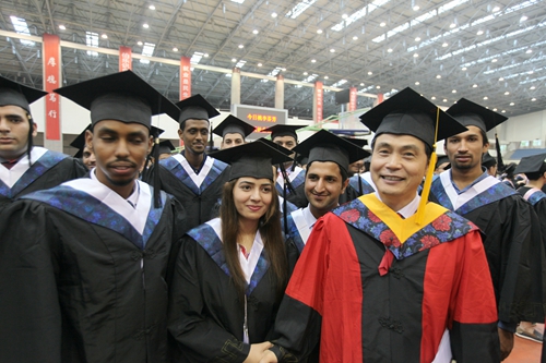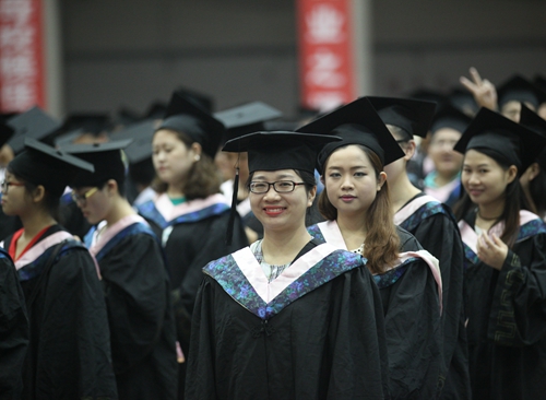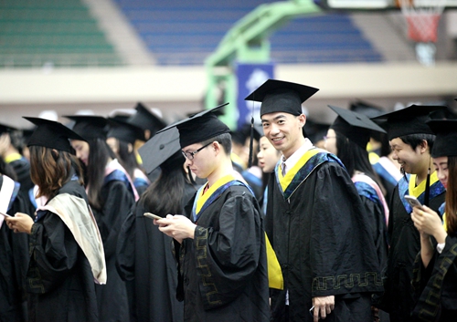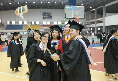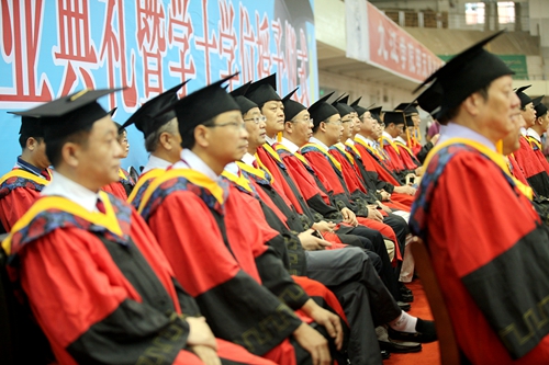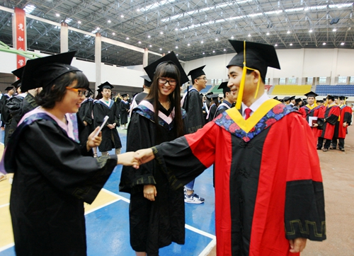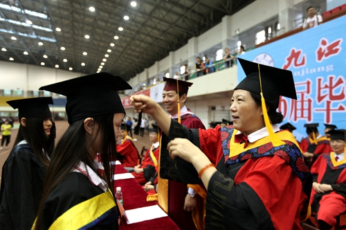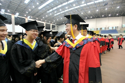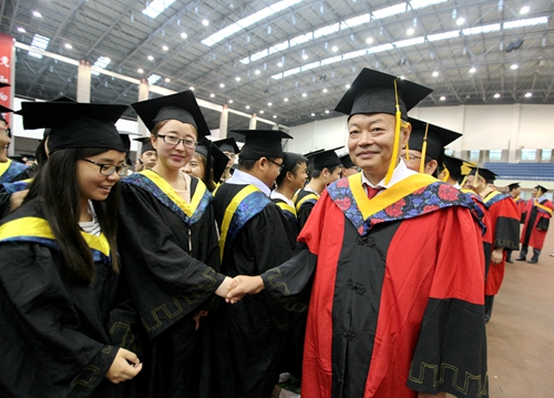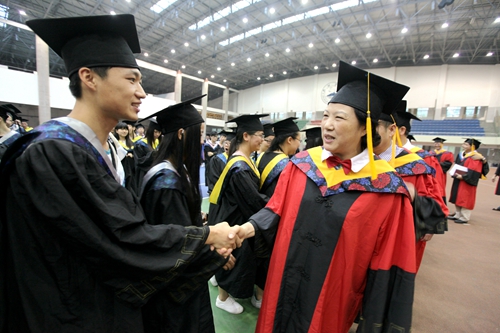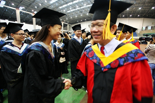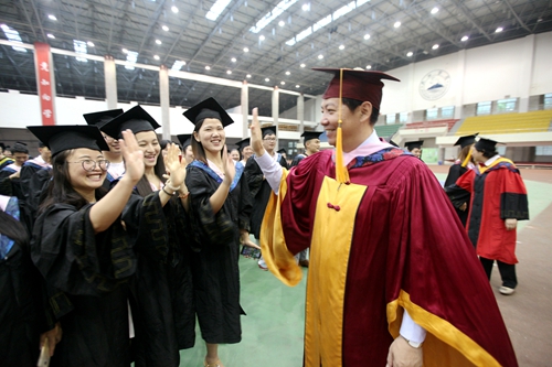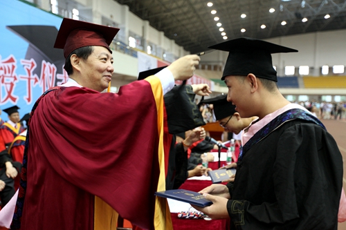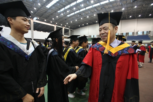 各二级学院领导和机关各部门负责人也分别走入毕业生队伍中,为全体毕业生扶正学位帽,拨转流苏。毕业生满怀激动,逐一快步趋前,向导师深深地鞠躬。整个会场气氛热烈、喜气洋洋,难忘的时刻凝聚在每个同学的笑脸上。