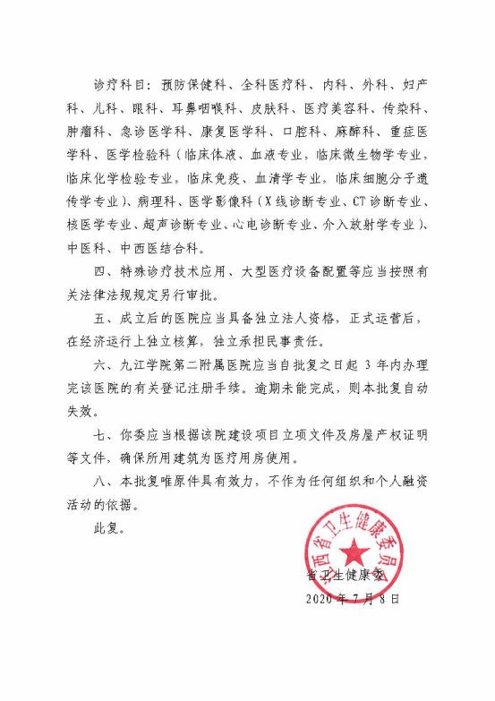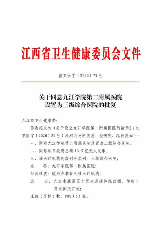 在九江市卫健委的关心和大力支持下,今年5月,贝博官网向省卫健委行文申办BB贝博艾弗森官方网站第二附属医院,2020年7月8日,获江西省卫生健康委员会发文批复同意(赣卫医字〔2020〕79 号)。