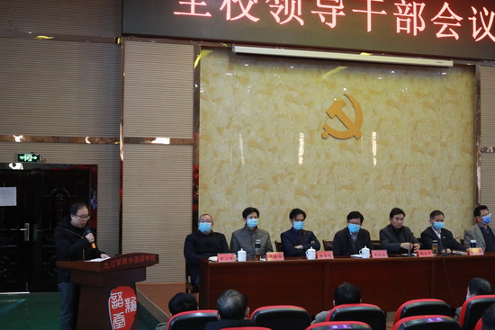 1月13日下午,学校在香远楼报告厅召开全校领导干部会议,对学期末和寒假工作进行部署安排。校党委书记赵伟,校长刘晓东,副校长纪岗昌、王万山、陈春生、杨耀防、夏启国、查振华,纪委书记李广欣,副校长陈小林,党委委员王殿元、冯健、刘遵海出席会议。会议由校党委副书记魏立平主持。全校各部门和二级学院党政负责人参加会议。