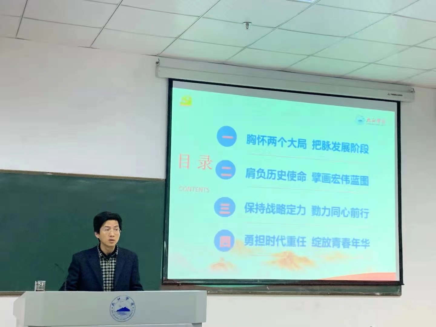赵伟以《百年征途谋新篇 雄心壮志启新程》为题,开始为学子们讲授思政第一课,他从“胸怀两个大局,把脉发展阶段”、“肩负历史使命,擘画宏伟蓝图”、“保持战略定力,勠力同心前行”和“勇担时代重任,绽放青春年华”四个方面,结合自身的生活求学经历、井冈山革命斗争、新冠肺炎疫情防控、习近平总书记2019年在江西考察情况、国家脱贫攻坚大会、国际国内时事和学校改革发展展望等事例为同学们上了一堂生动的形势与政策课。90分钟的讲述中,他旁征博引、娓娓道来,通过大量的图片,展示了新中国波澜壮阔的锦绣画卷和历史性跨越。