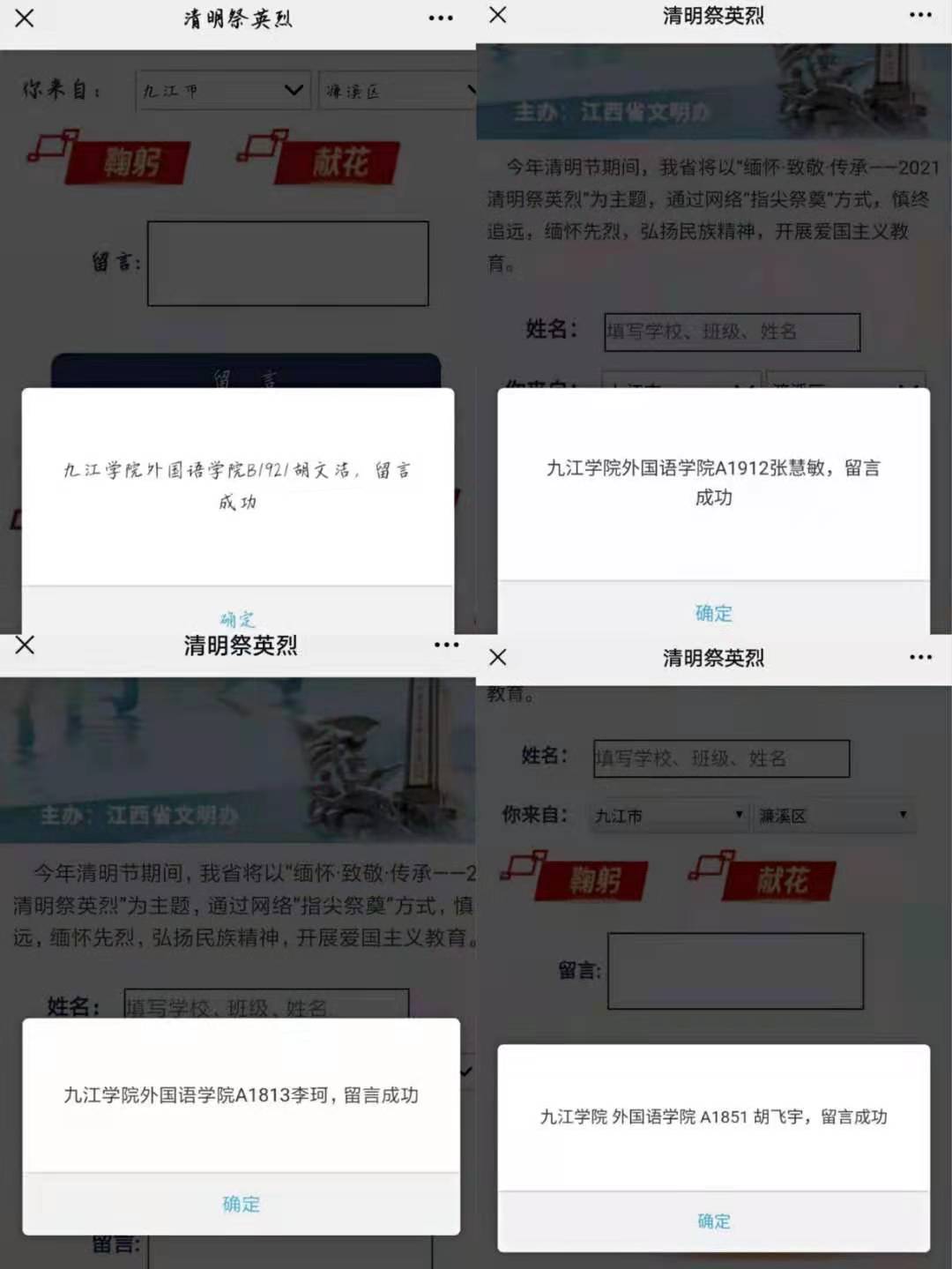 电子信息工程学院以“学党史、祭英烈、感党恩、跟党走”为主题开展“网上祭英烈”活动,通过网上“云”参观的形式,带领学生们参观了九江市烈士陵园,近距离感受了革命先辈的光荣事迹,寻觅九江红色印记。