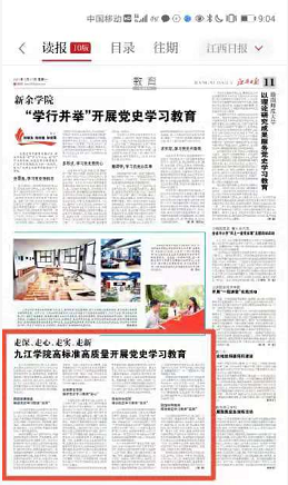 学校党史学习教育特色亮点得到人民日报、新华社、中新社、中青网、学习强国、江西日报、江西卫视、省委党史学习教育简报、省委党史学习教育专题网、省委教育工委党史学习教育简报等媒体及平台的关注和报道,学习教育氛围浓厚。(骆辉)