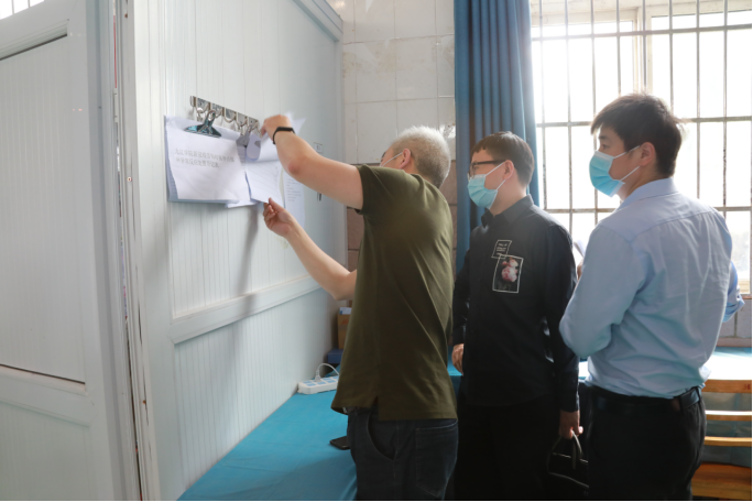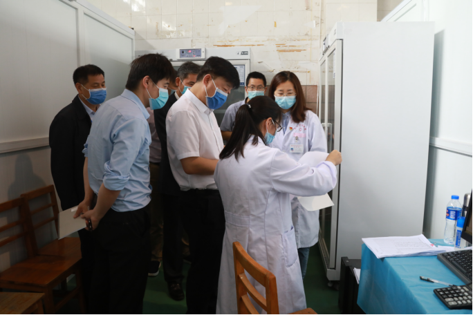 专家们仔细查看疫苗接种流程、接种场地分区设置、疫苗管理等情况