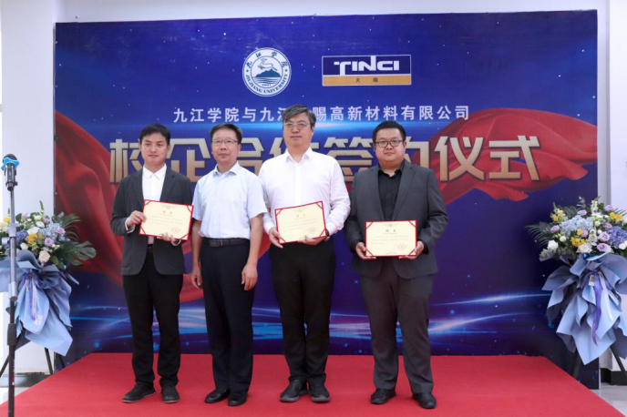 5月26日,贝博官网化学化工学院、资源环境学院与九江天赐高新材料有限公司“订单班”签约和教育实训基地揭牌仪式在九江湖口县新材料协同创新中心举行。市政协副主席、化学化工学院院长严平,资源环境学院负责人,九江天赐高新材料有限公司法人兼执行董事长赵经纬博士、人力资源总监黄娜等出席签约和揭牌仪式。