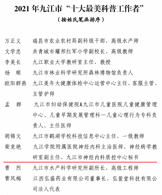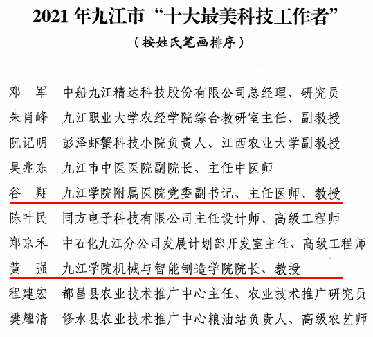 近日,中共九江市委人才工作领导小组办公室、九江市科学技术局、共青团九江市委、九江市科学技术协会联合下发了《关于选树2021年九江市“十大最美科技工作者”、“十大最美青年科技工作者”、“十大最美科普工作者”的决定》。贝博官网教师谷翔、黄强、何刚、张化浩、柴竞艳获得九江市三个最美系列荣誉称号,其中黄强、谷翔荣评2021年九江市“十大最美科技工作者”,何刚、张化浩获评2021年九江市“十大最美青年科技工作者”,柴竞艳获评2021年九江市“十大最美科普工作者”。