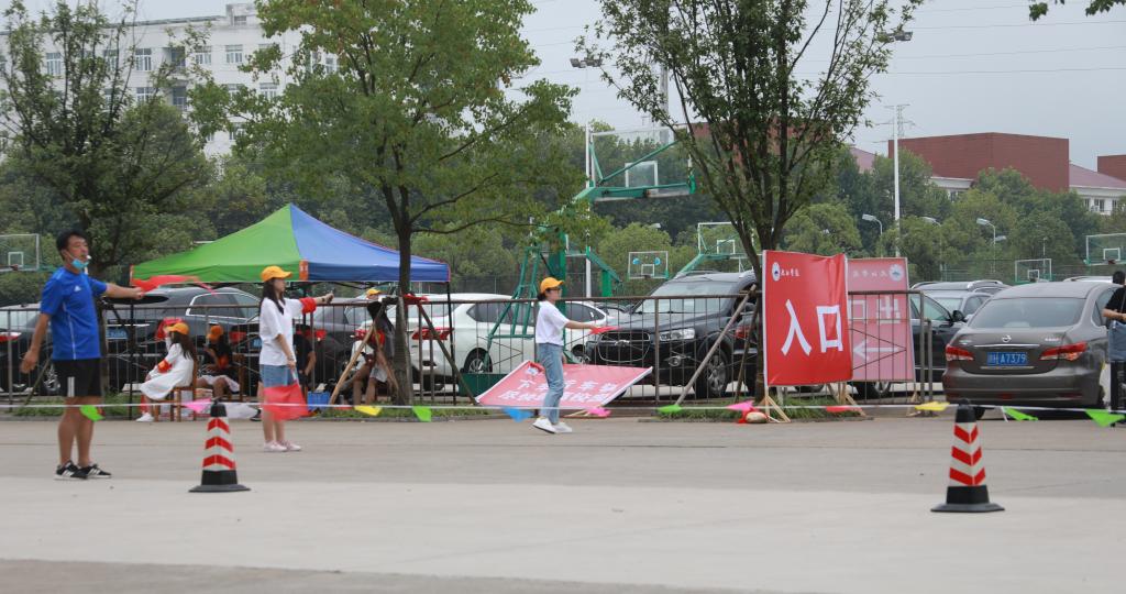 “这边有停车场,车向前走,停在停车场......”操场的另一边,志愿者们正在指挥开车前来的家长们将车有序停放在临时停车场。人流、车流,北区田径馆外热闹非凡,却又井然有序。