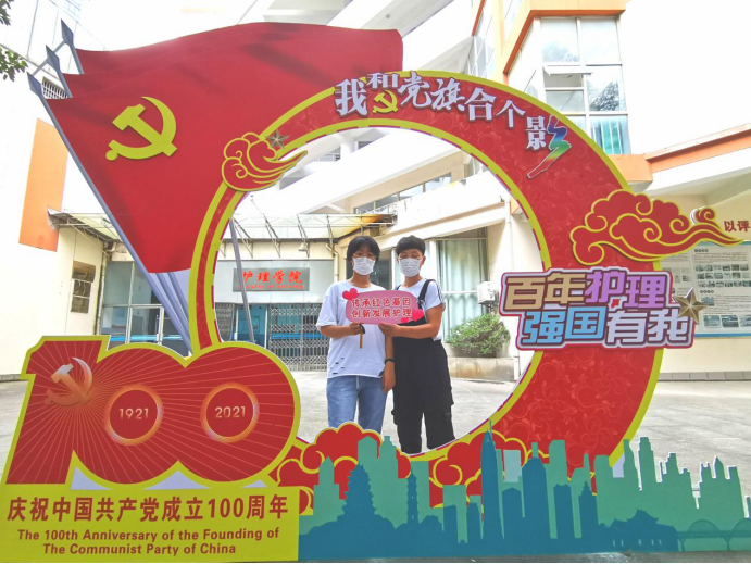 在护理学院教学楼前,许多新同学正在“我和党旗合个影”的网红打卡点拍照留念。拿着录取通知书或手牌与党旗合影,许下“请党放心,强国有我!”的郑重承诺。一名刚刚拍完照片的新生兴奋地说:“这个活动太有特色了,我刚刚发了朋友圈,点赞无数啊!”