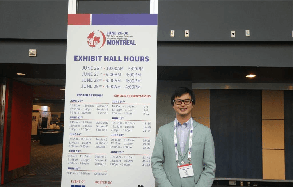 他还十分重视学术交流,多次在学院内部举行学术报告,分享学术见闻,积极参加国内外的学术会议,如2018受邀前往加拿大参加“国际应用心理学大会”进行现场报告,与来自世界各地的心理学家们共同交流。