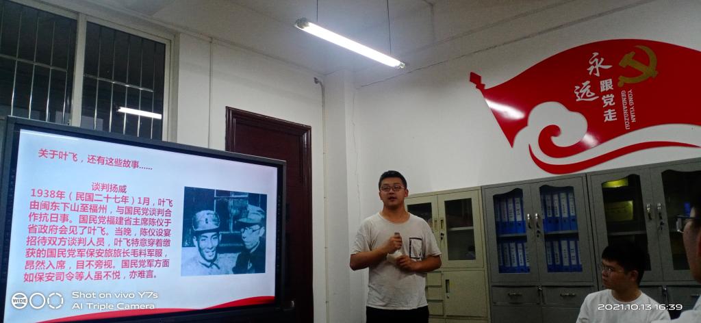 10月13日下午,“文心琢玉”思政工作室举办了“琢玉·党史故事会”。会上,5名学生依次讲述了赵一曼、叶飞、杨靖宇、周恩来、杨根思等革命前辈的爱国故事,深情地抒发了同学们对革命英雄的崇敬之情。“琢玉·党史故事会”以党史学习教育为契机,以学生分享、教师点评的交流形式,表达了师生心中对党和祖国的真挚情感,引导学生感党恩、颂党情、听党话、跟党走。