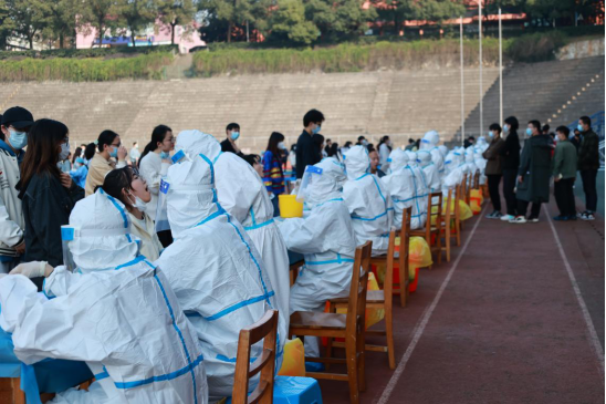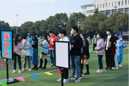 检测时,参检师生带好口罩,按照预先安排顺序,错峰进入运动场,每10人一组,扫码登记,在30个采集点检测采样,然后快速撤离采样区,整个过程井然有序。