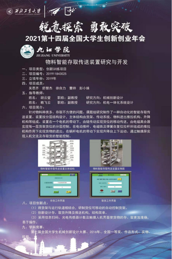 此外,贝博官网还在本届大赛中取得了另两项首次突破,机械与智能制造学院由吴思齐、舒慧杰、徐自力、曹帅、彭小妹五名同学负责和胡云堂、赖飞云两位老师指导的《物料智能存取传送装置研究与开发》项目入选第十四届全国大学生创新创业年会改革成果展示项目(全省共9项);创新创业学院负责人宋士华成功入选中国国际“互联网+”大学生创新创业大赛入库评审专家。