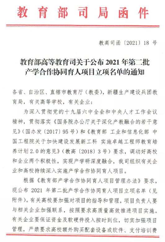 据了解,教育部产学合作协同育人项目旨在贯彻落实《国务院办公厅关于深化产教融合的若干意见》精神,落实《教育部工业和信息化部中国工程院关于加快建设发展新工科实施卓越工程师教育培养计划2.0的意见》和《教育部产学合作协同育人项目管理办法》要求,通过政府搭台、企业支持、高校对接、共建共享,深化产教融合,促进教育链、人才链与产业链、创新链有机衔接,以产业和技术发展的最新需求来推动高校人才培养改革。