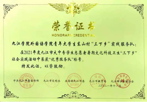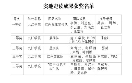 贝博官网各二级学院积极开展“唱响红色经典,凝聚奋进力量”“红色走读”活动,教育引导广大青年学生坚定理想信念,自觉争当红色基因的传承者、实践者。近日,省委教育工委、省教育厅组织开展的全省高校“红色走读”活动获奖名单公布,贝博官网多个团队取得优异成绩,荣获“实地走读成果”一等奖1个、二等奖1个、三等奖3个;荣获“讲述发生在江西红土地上的党史故事比赛”三等奖4个。各二级学院开展“三下乡”暑期学生社会实践活动,其中,外国语学院青年大学生赴东山村“三下乡”实践服务队被评为九江市大中专学生志愿者暑期文化科技卫生“三下乡”社会实践活动优秀服务队,文学与传媒学院三下乡服务队喜获2021年度九江市大中专学生志愿者暑期文化科技卫生“三下乡”社会实践活动优秀服务队、2021年度BB贝博艾弗森官方网站暑期文化科技卫生“三下乡”社会实践活动优秀服务队荣誉称号。