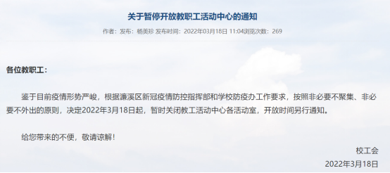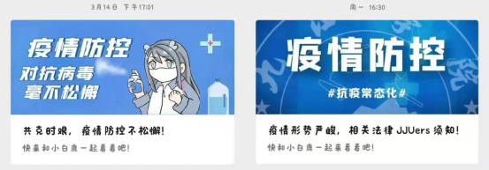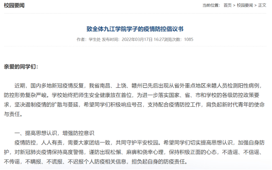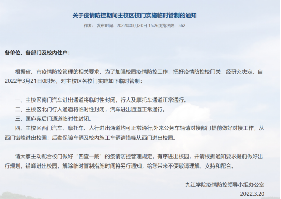 为做好防疫宣传工作,普及防疫科学知识,提升防控意识,让学院师生们以更加积极的心态应对疫情,校疫情防控领导小组办公室、学生处、校工会等部门分别发布了《关于疫情防控期间主校区校门实施临时管制的通知》、《致全体BB贝博艾弗森官方网站学子的疫情防控倡议书》、《关于暂停开放教职工活动中心的通知》等。