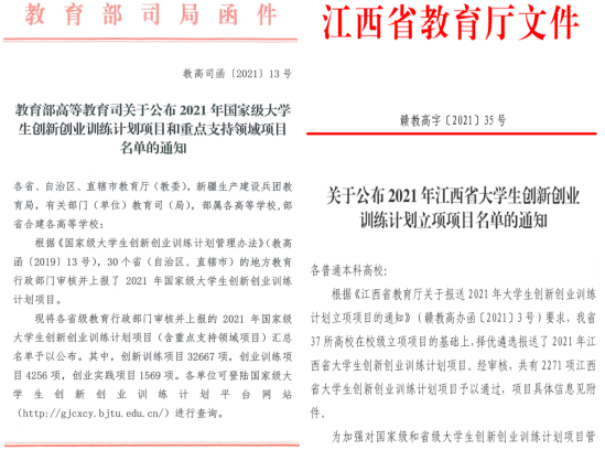 根据《教育部高教司关于公布2021年国家级大学生创新创业训练计划项目和重点支持领域项目名单的通知》(教高司函〔 2021〕13号)和《关于公布2021年江西省大学生创新创业训练计划立项项目名单的通知》(赣教高字〔2021〕35号)公布结果,《“双凝胶互穿法”制备多孔碳材料及其电化学储能性能研究》等30个项目获国家级项目立项,《基于佳点集和莱维飞行的蜉蝣优化算法研究》等50个项目获省级项目立项;在学校原有基础上,贝博官网国家级和省级大学生创新创业训练计划项目立项总数再上新台阶,共计80项。