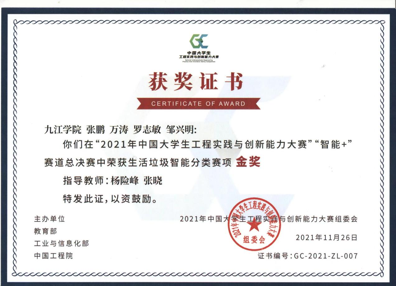 在2021年中国大学生工程实践与创新能力大赛全国总决赛中,贝博官网学子发挥出色,勇创佳绩,荣获大赛总决赛金奖1项,银奖2项,获大赛历史最佳和江西省工程组第一名,位居全国第34;其中机械与智能制造学院的智能垃圾分类装置项目(学生:张鹏、罗志敏、邱海燕、丁立峰、刘泽荣,指导老师:杨险峰、张晓)获国赛金奖(全国第六名)、智能配送无人机项目(学生::吕苏伟、万钰雯、颜日广、陈雪魁,指导老师:刘对、曾宪任)获国赛银奖(全国第十一名);材料科学与工程学院的水下管道智能巡检装置项目(学生:汤俊、岳继强、徐杰、何武荣,指导老师:满达虎、张德勤)获国赛银奖(全国第十名)。中国大学生工程实践与创新能力大赛由教育部、工业和信息化部、中国工程院主办,是列入《教育部评审评估和竞赛清单(2021年版)》(教政法厅函(2021)2号)的重要赛事,是全国大学生工程训练综合能力竞赛的升级完善版,是高校工程类竞赛中最高荣誉、最高含金量、最高竞技水平、最具影响力的赛事。