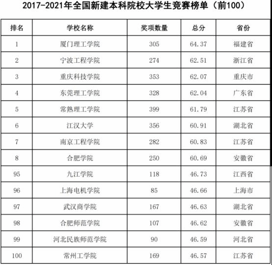 学校首次进入全国新建本科院校大学生竞赛榜单前100名