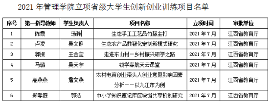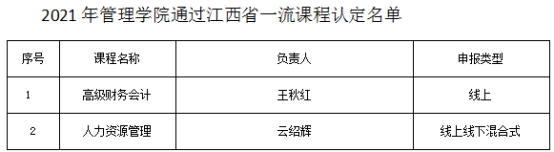 管理学院充分发挥全国会计领军人才的引领作用,大力进行教学改革和建设,积极申报国家级、省级一流专业、一流课程等各类教学改革项目。2021年,该学院《审计学》课程推荐参加国家级线上线下混合式课程评选,《高级财务会计》和《人力资源管理》已通过江西省一流本科课程认定,另有《成本管理会计》《组织行为学》《市场营销学》等10门课程获得校级一流本科课程建设项目立项。会计学专业主干课程群慕课应用型教学团队获批省级教学团队,出版应用型教材2部,立项省级教改课题2项、教育部产学研协同育人项目11项。