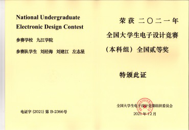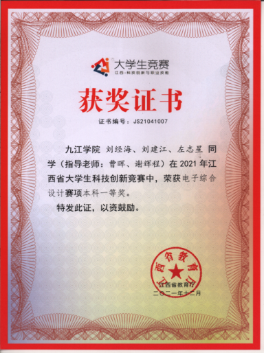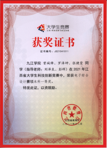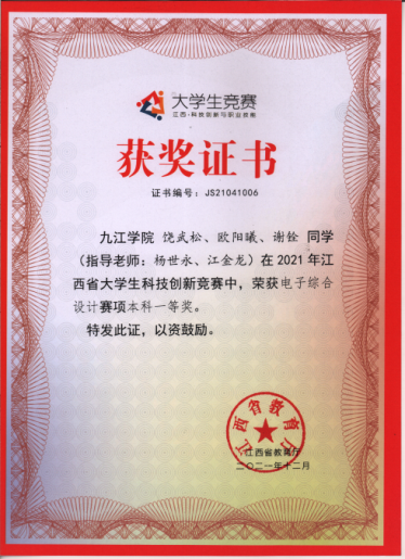 该学院在教学过程中,积极将获奖学科竞赛项目融入到课堂教学案例、课程设计、毕业设计等教学环节,同时在竞赛培育阶段,利用获奖项目,分模块对学生进行培训。学院利用电子协会平台,在课外通过由浅入深的竞赛项目训练,采用老带新和教师辅导的方式,训练学生的实践能力和创新能力。学院为学生提供仪器设备、电子元器件,实验室开放管理机制为学生平时活动提供便利,形成了高年级学生指导低年级学生参与竞赛的机制,实现了技术积累、经验共享,递队形成。学院在2021年全国大学生电子设计大赛中获国家二等奖3项,江西省一等奖3项、二等奖2项,团体总分在全省高校中排名第二,仅次于承办院校江西科技师范大学。