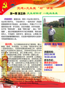 学院充分利用博士教师人数较多的优势,定期举办“党建+天生我‘材’”大讲堂,该活动旨在进一步发挥党员干部在立德树人中的带头作用,锻炼提升党员教师讲座能力,展示其学术水平,引导其做“四有好老师”,做学生的“四个引路人”,做到“四个相统一”,激发学术兴趣,营造良好的院风学风,为实现中华民族伟大复兴的中国梦,努力学习,成人成才。活动主要内容:面向全院师生结合个人求学、工作经历和研究情况,宣讲国家重大发展战略、分析国家“卡脖子”技术、普及国内外最新科技前沿、分享个人成长感悟与学术成果、解读学科专业与就业发展方向、解读各类项目和学科竞赛政策等。目前已开展了4期。