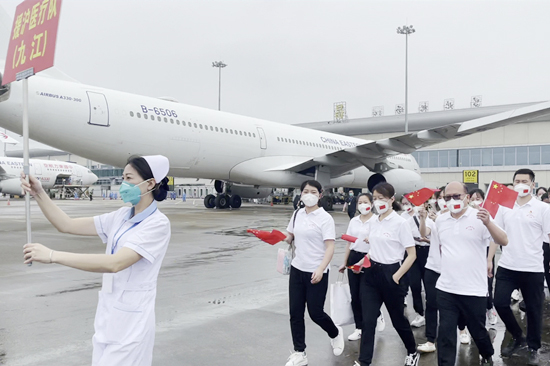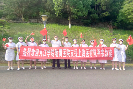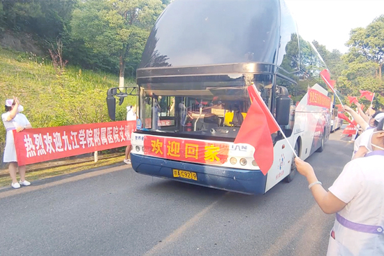 5月26日下午,江西省支援上海医疗队共1270名队员乘机平安返回江西,南昌昌北国际机场用民航界最高礼仪“过水门”的方式迎接医护人员们凯旋,省委、省政府、省卫健委领导到机场迎接。在机场短暂的欢迎仪式后,九江医疗队乘大巴前往庐山市开始隔离休整。市卫健委领导,BB贝博艾弗森官方网站附属医院负责人带领医护代表等前往隔离酒店迎接。