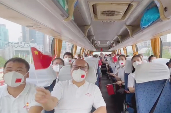 当日上午,上海驻地,红旗飘扬,医疗队满怀喜悦和激动之情与上海人民告别。上海市委市政府领导,上海市卫健委、区政府和各定点医院领导前往驻地为队员送行,驻地酒店和不少群众自发赶来热情相送。当医疗队队员乘坐的大巴驶进市区道路,上海警车开道,铁骑护卫。