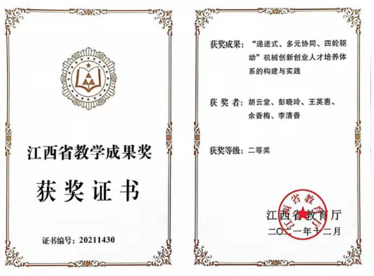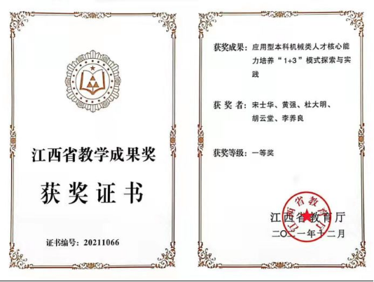 学院注重教学成果培育,积极组织教师开展教育教学改革,积极凝练改革成果并组织申报教学成果奖。2021年学院获第十七批江西省教学成果奖2项,其中《应用型本科机械类人才核心能力培养“1+3”模式探索与实践》获一等奖,《“递进式、多元协同、四轮驱动”机械创新创业人才培养体系的构建与实践》获二等奖。