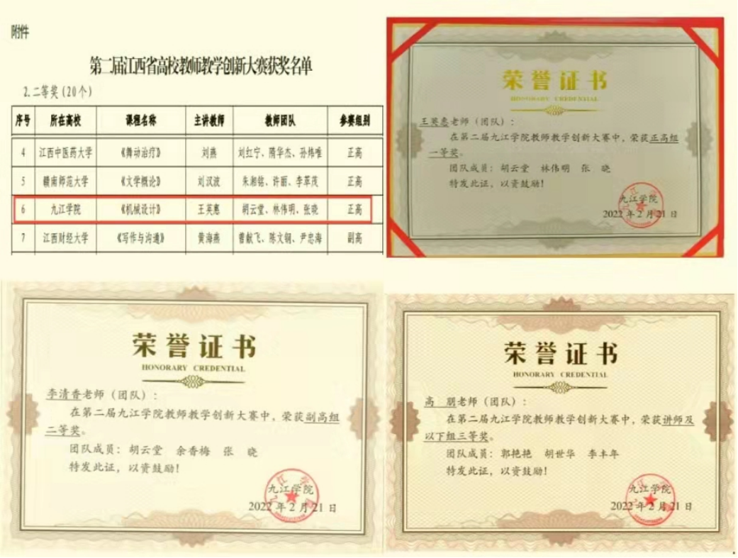 以教师教学创新大赛、教师教学竞赛为抓手,深化课堂教学改革和提高教师教学能力,达到以赛促教、以赛促能的目的,全面提升学院教师教学水平。开展丰富的教学活动,增进新老教师的沟通和交流,引导和鼓励教师改进教学方法,提高教学技巧,不断提升教师的教学能力。机械与智能制造学院实践教学团队荣获九江市“工人先锋号”荣誉称号;5名教师在学校教学大赛中获奖,其中王英惠教授的教学团队在第二届江西省高校教师教学创新大赛荣获正高组二等奖,在校级总决赛中荣获正高组一等奖,李清香、陈爱霞、高朋、仪登亮等老师也获得了校级及以上的教学大赛奖。
