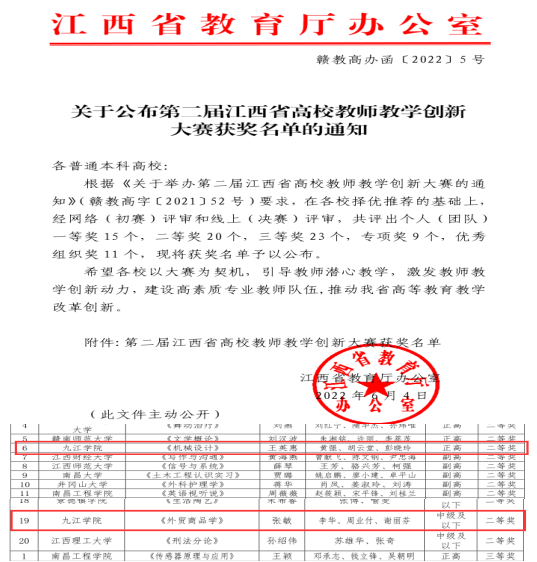 近日,江西省教育厅公布了第二届江西省高校教师教学创新大赛获奖名单,贝博官网选派的机械与智能制造学院王英惠教学团队和经济学院张敏教学团队在众多参赛教师团队中脱颖而出,分别荣获正高组和讲师及以下组二等奖。